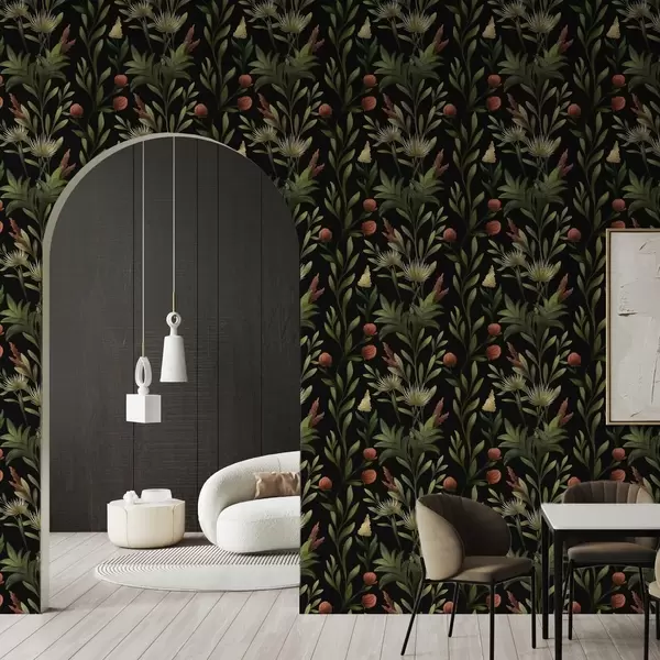 Papel pintado Hierbas altas y flores sobre fondo negro, estampado detallado a00620