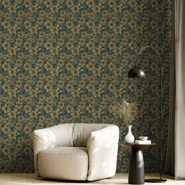 Papel pintado Flores ocres sobre fondo verde intenso, patrón denso Nr. a00628