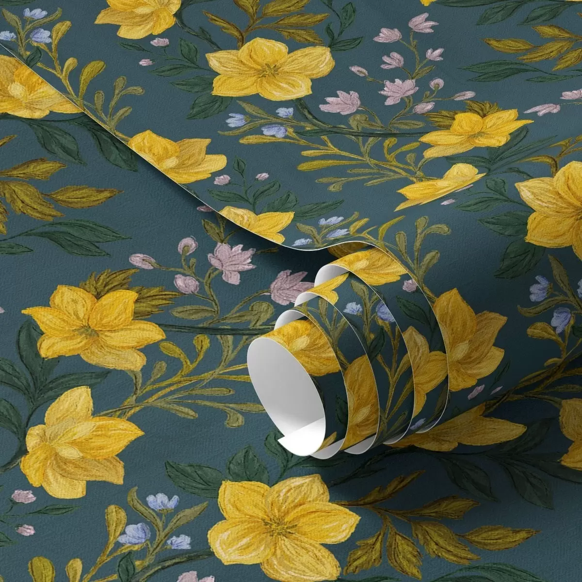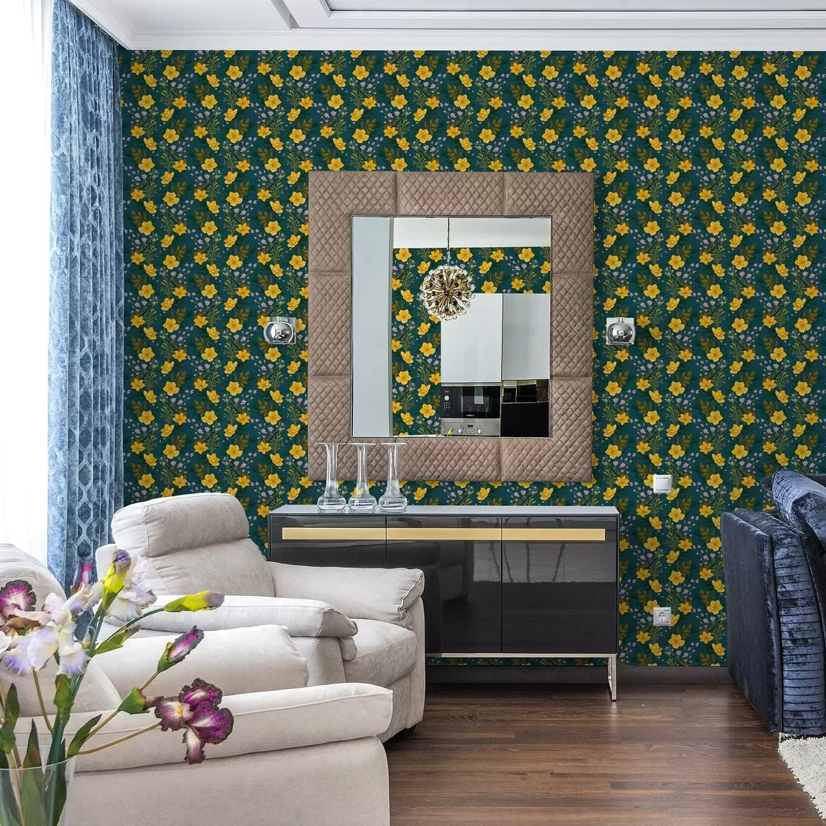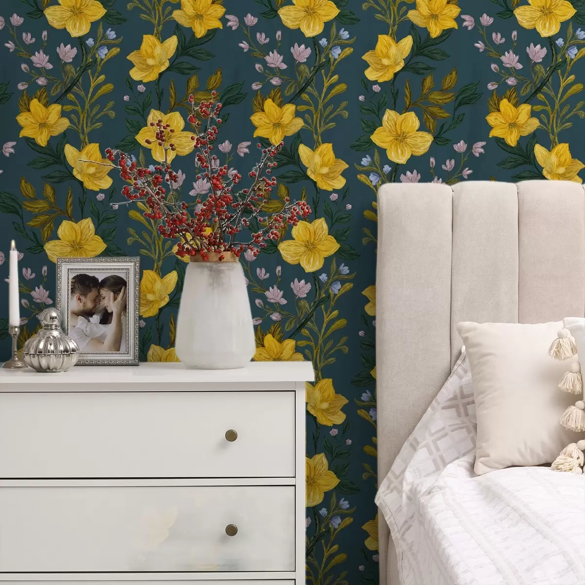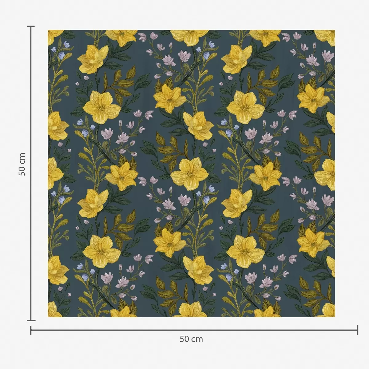 Papel pintado Flores amarillas en guirnaldas verticales sobre fondo azul oscuro Nr. a00632v2