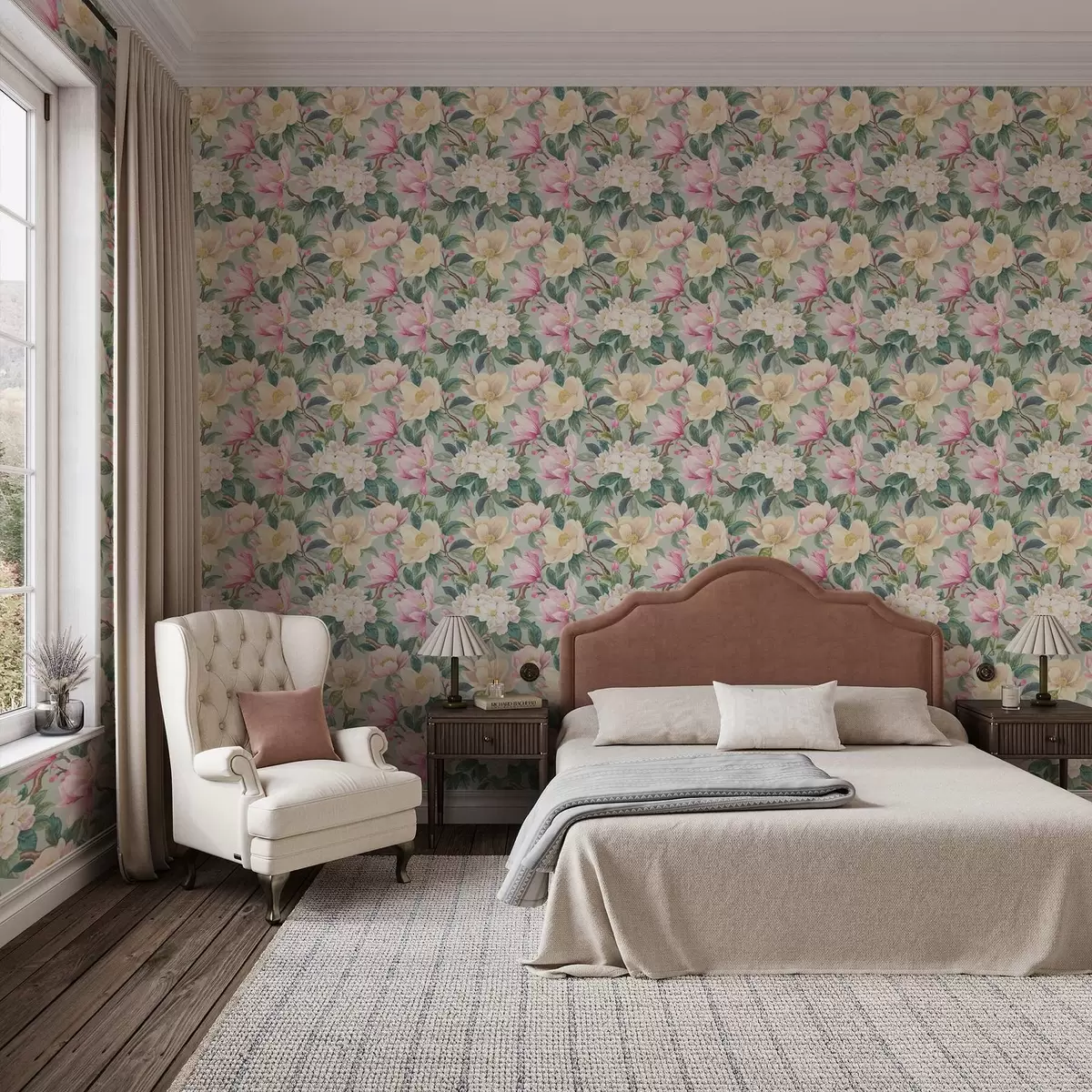 Papel pintado Magnolias y flores blancas sobre fondo gris menta Nr. a00644