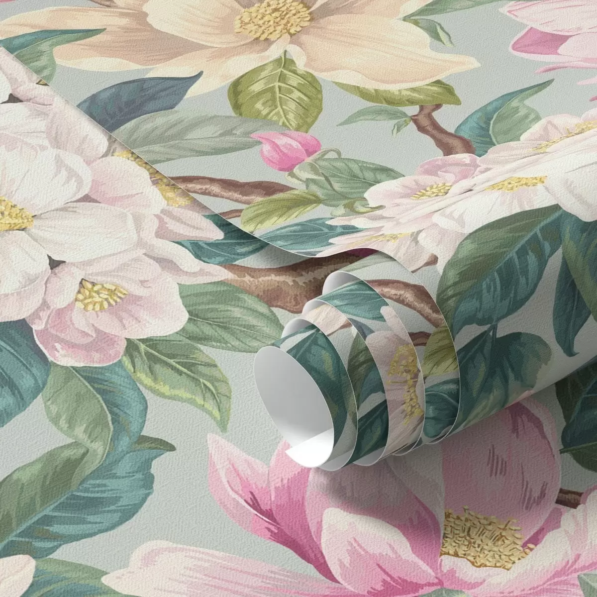 Papel pintado Magnolias y flores blancas sobre fondo gris menta Nr. a00644