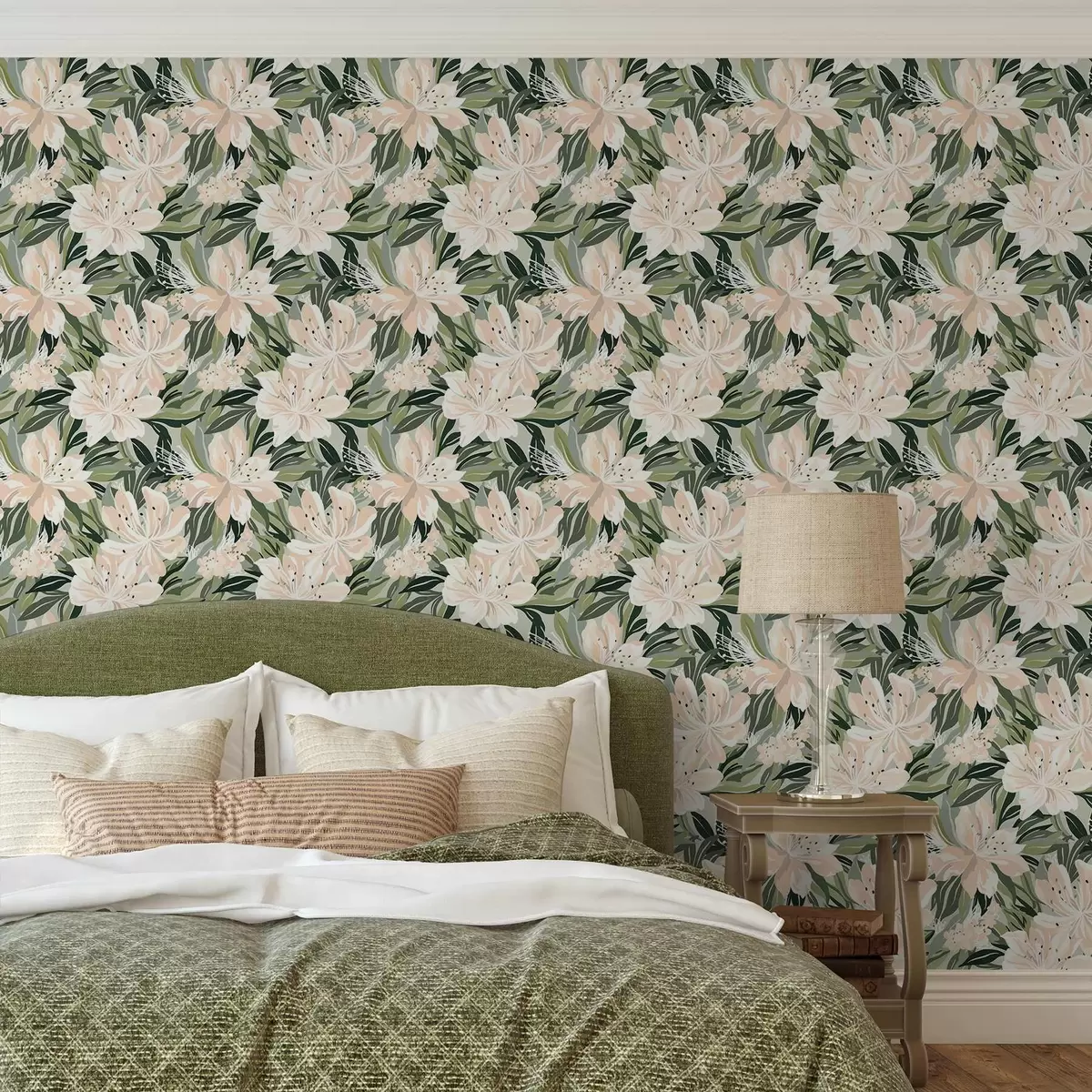 Papel pintado Grandes flores color crema sobre fondo verde claro Nr. a00646