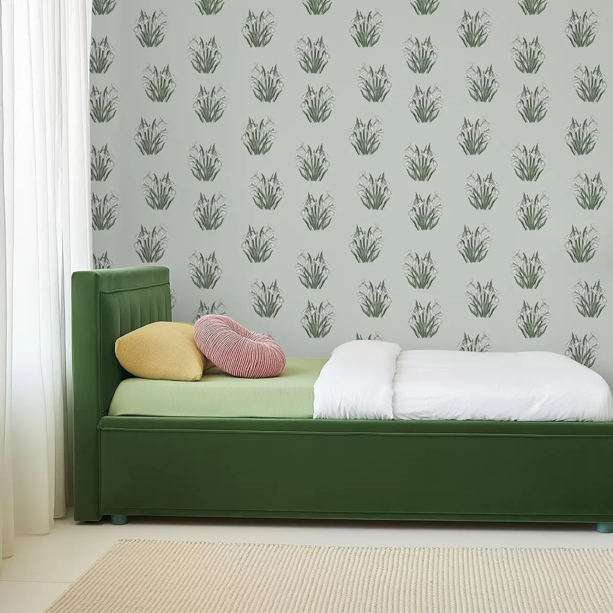 Papel pintado Campanillas de invierno con hojas verdes sobre fondo verde pastel Nr. a00651