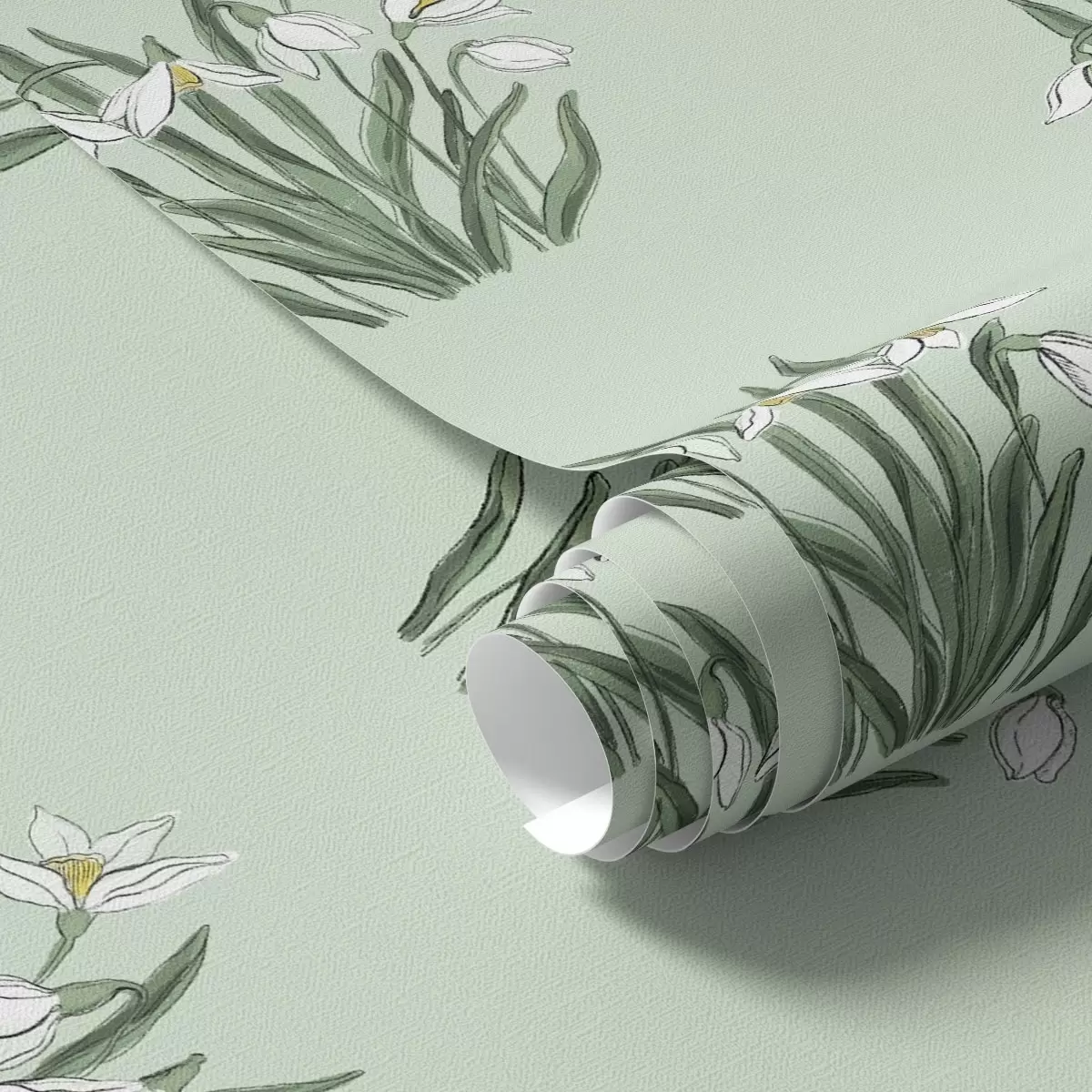 Papel pintado Campanillas de invierno con hojas verdes sobre un fondo amarillo cálido Nr. a00651v3