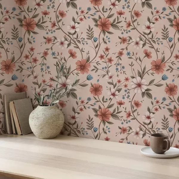 Papel pintado Flores y follaje de color rosa coral sobre fondo rosa empolvado Nr. a00667