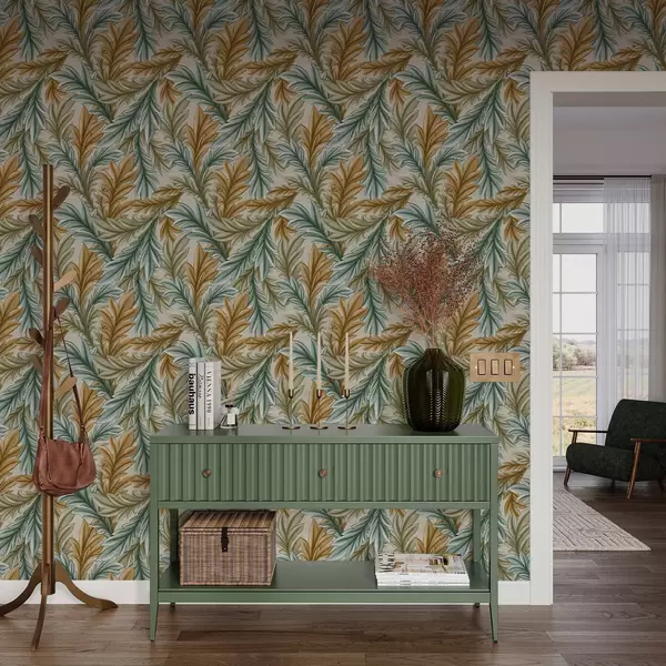 Papel pintado Follaje decorativo en una cálida paleta de colores ocres y verdes a00673
