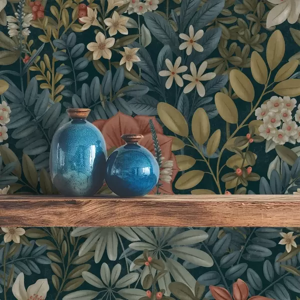 Papel pintado Fondo oscuro con densas flores y hojas en tonos cálidos Nr. a00678