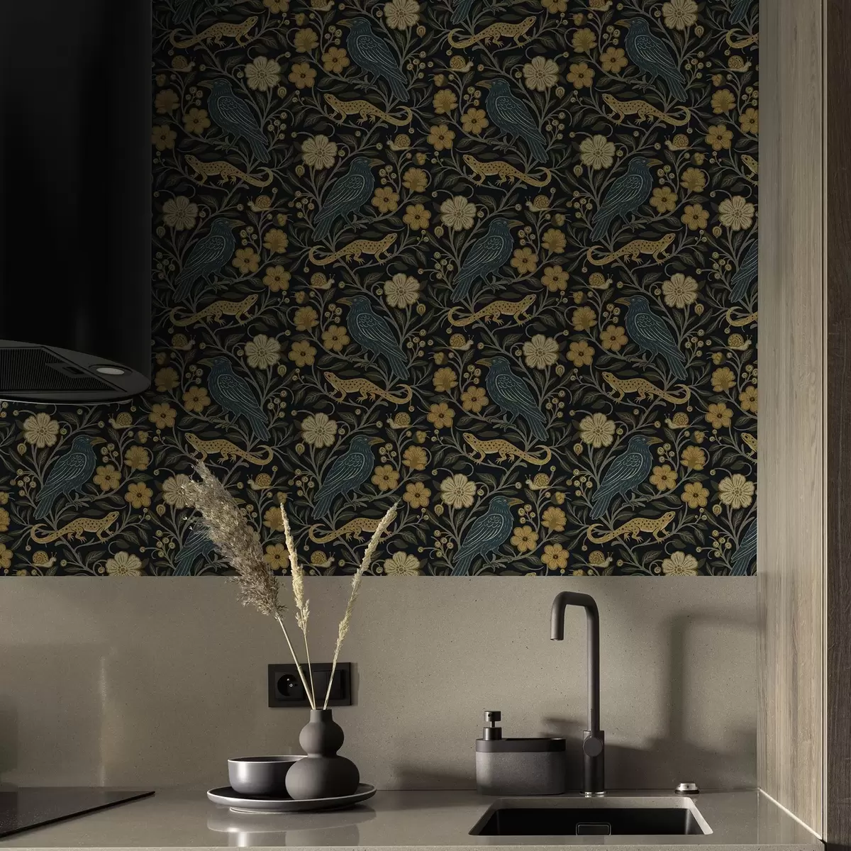 Papel pintado Pájaros, lagartos y caracoles entre flores sobre un fondo oscuro Nr. a00691