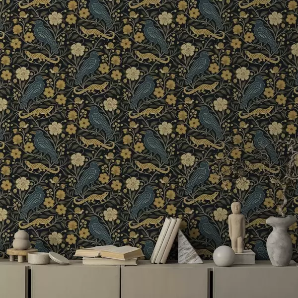 Papel pintado Pájaros, lagartos y caracoles entre flores sobre un fondo oscuro Nr. a00691