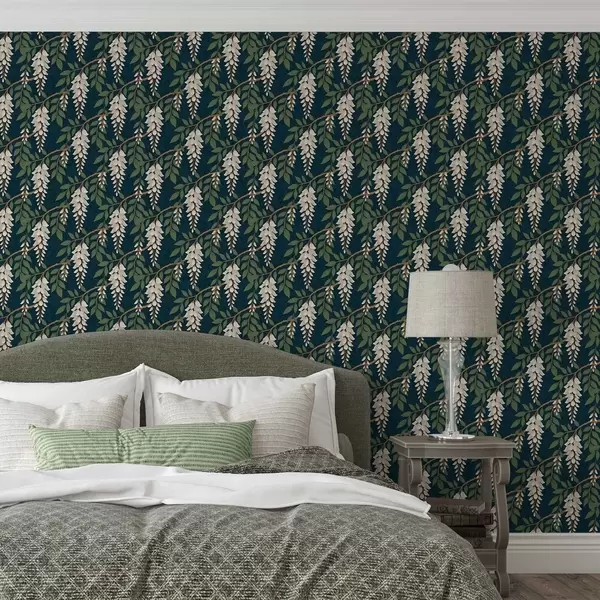 Papel pintado Glicinia marfil sobre fondo verde azulado intenso a00694v1