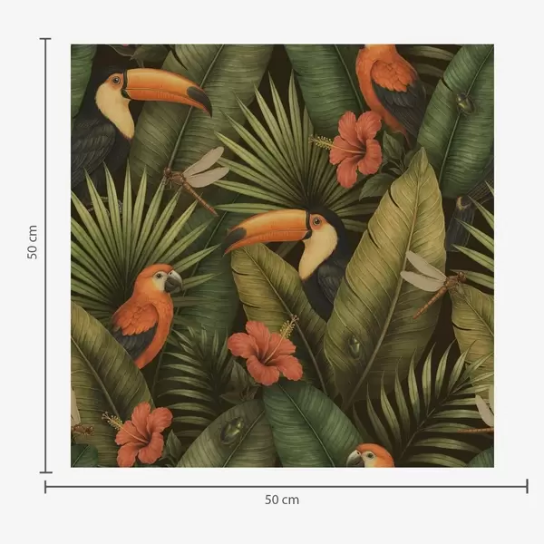 Papel pintado Tucanes y loros entre el follaje y las flores tropicales Nr. a00702