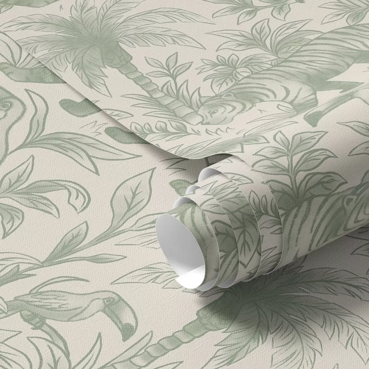 Papel pintado Tigres y aves tropicales entre palmeras sobre un fondo claro a00711
