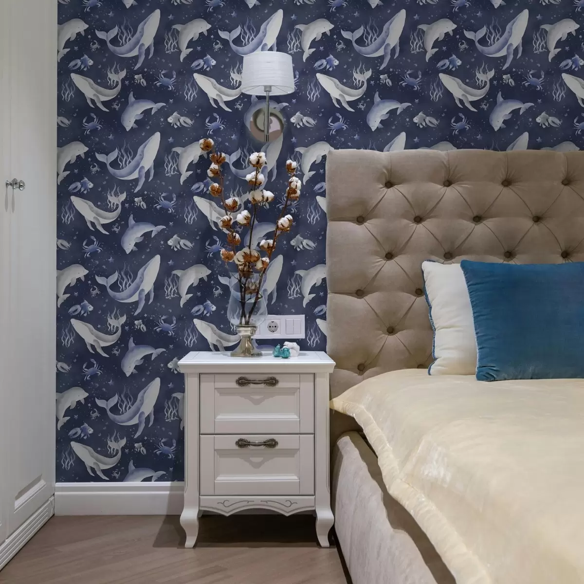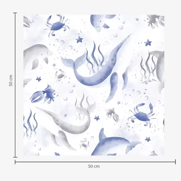 Papel pintado Ballenas marinas, delfines y cangrejos sobre un fondo azul oscuro Nr. a00720