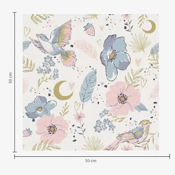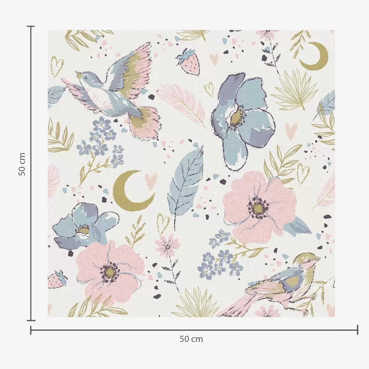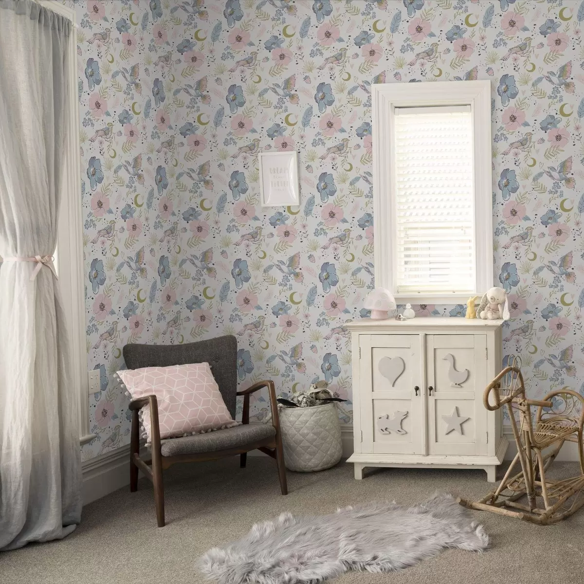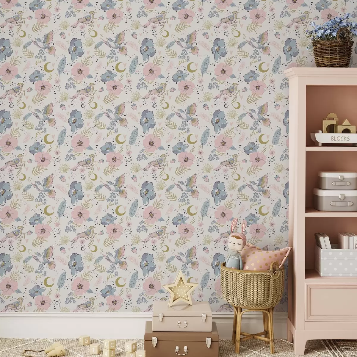 Papel pintado Aves y flores en tonos pastel con lunas crecientes sobre fondo blanco Nr. a00721