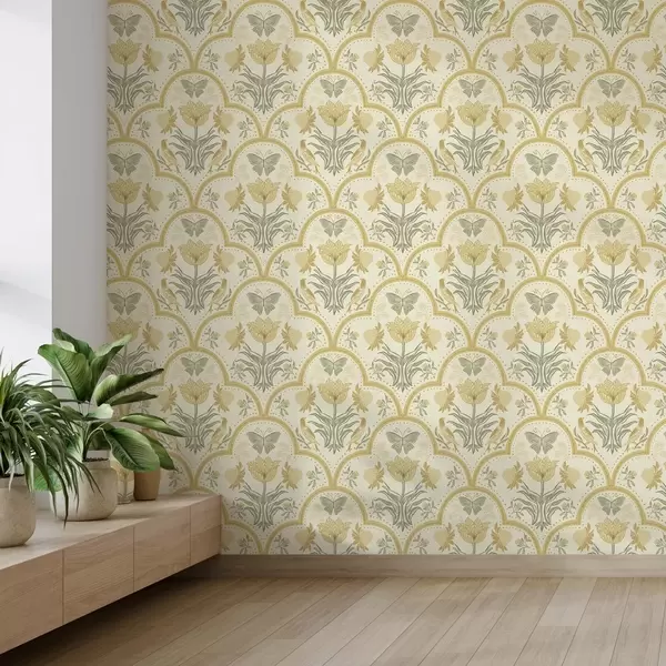 Papel pintado Adorno con tulipán, pájaros y mariposas, ocre a00722