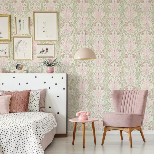 Papel pintado Fuentes, colibríes y volutas verdes sobre fondo claro Nr. a00723