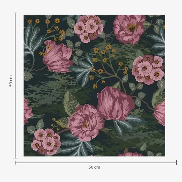 Papel pintado Flora oscura con flores y hojas rosadas, fondo intenso Nr. a00724