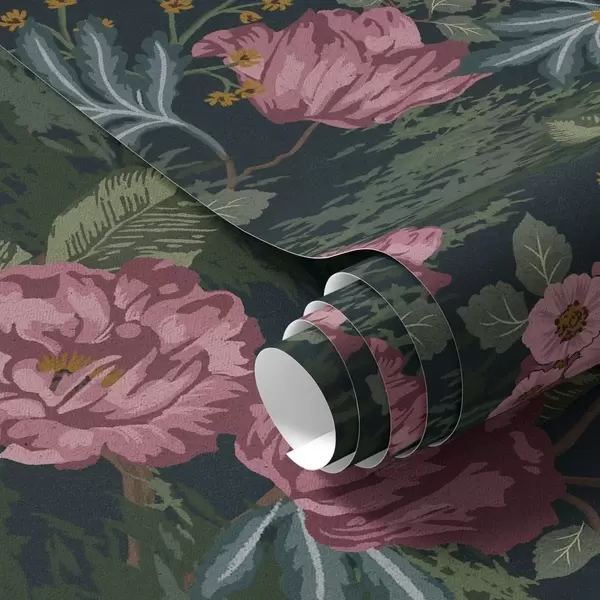 Papel pintado Flora oscura con flores y hojas rosadas, fondo intenso a00724