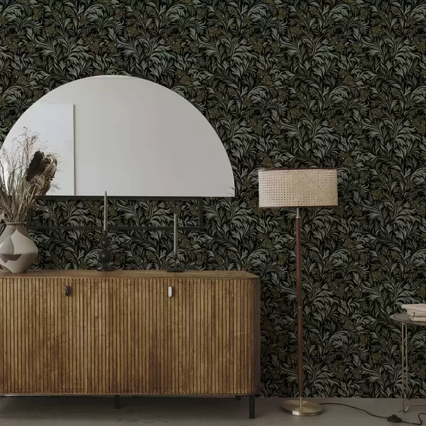 Papel pintado Hojas oscuras de acanto con conos amarillos sobre fondo negro. Nr. a00745
