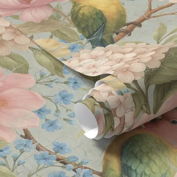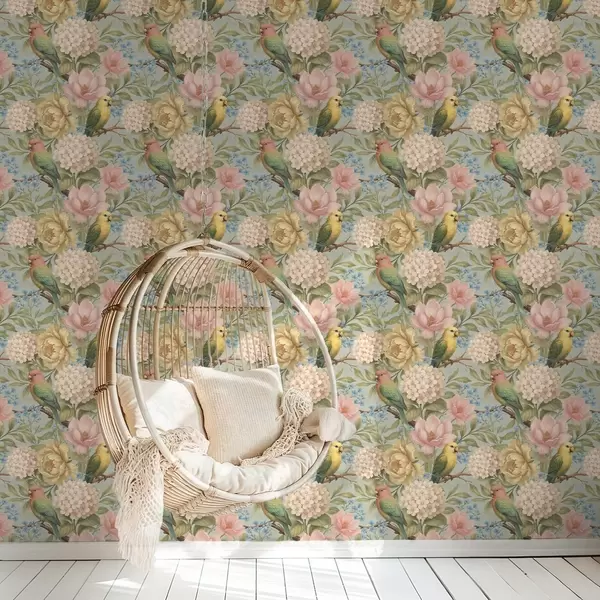 Papel pintado Loros entre peonías, hortensias y magnolias Nr. a00747