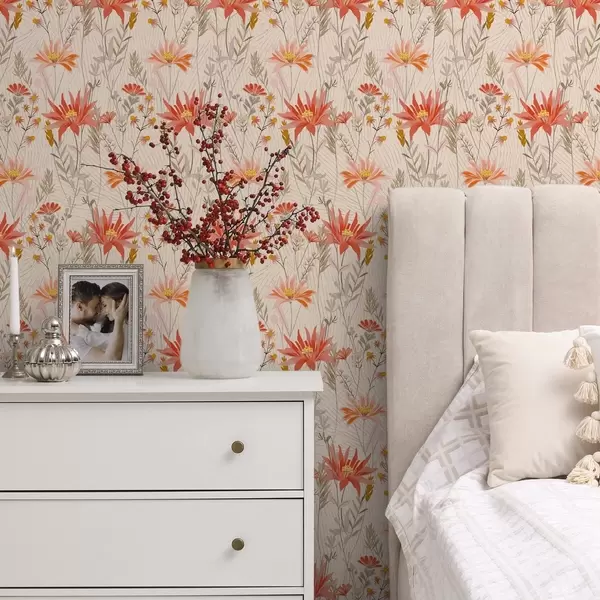 Papel pintado Flores silvestres en tonos cálidos sobre fondo beige a00751