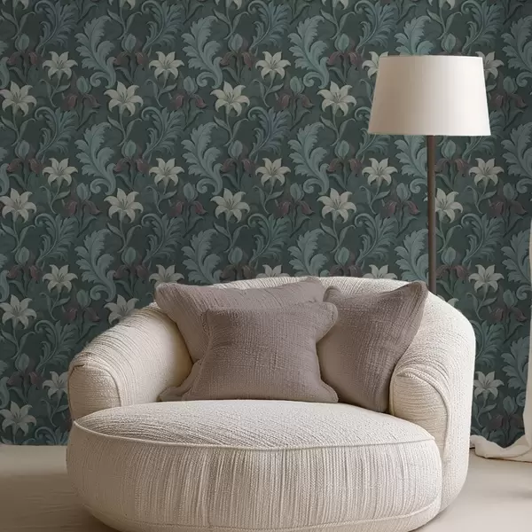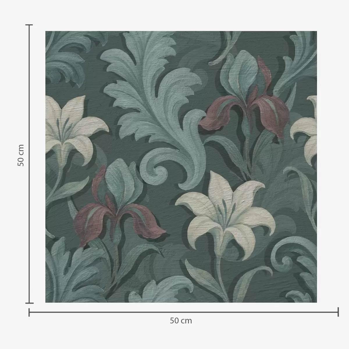 Papel pintado Fondo verde oscuro con iris y hojas decorativas Nr. a00755