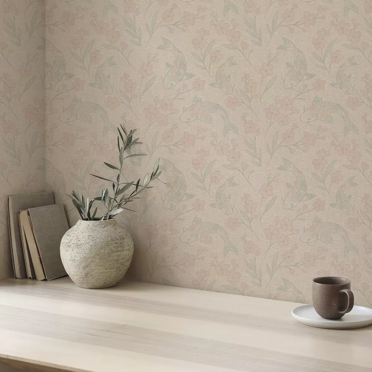Papel pintado Carpas entre flores en suaves tonos beige y rosa Nr. a00766