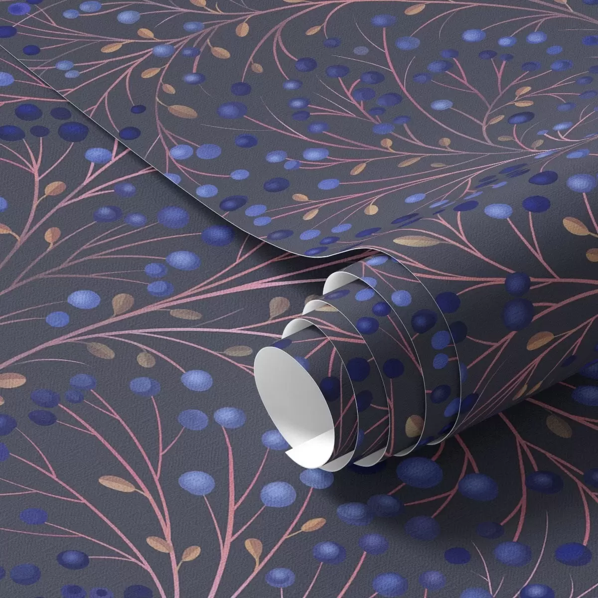 Papel pintado Ramitas de color rosa-marrón y bayas azules sobre fondo grafito Nr. a00787