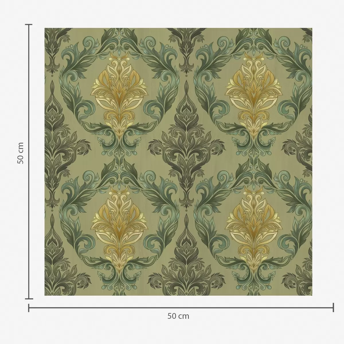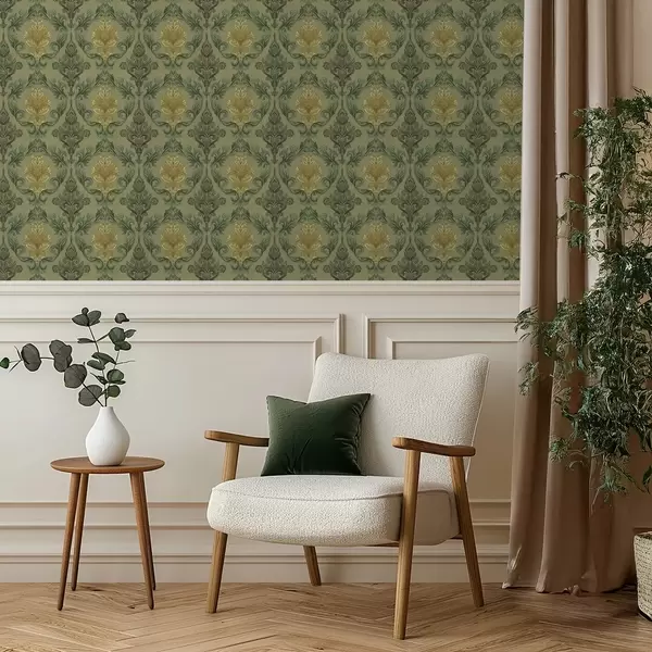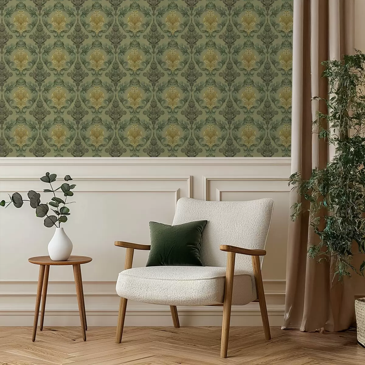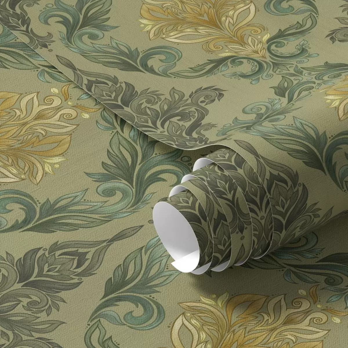 Papel pintado Damasco con volutas vegetales, paleta de colores oliva y ocre. Nr. a00828