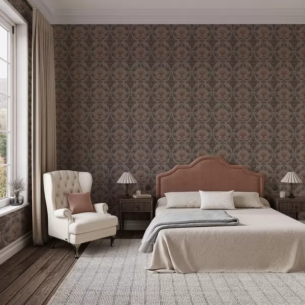 Papel pintado Damasco en tonos marrón-terracota, fondo gris cálido. Nr. a00828v2