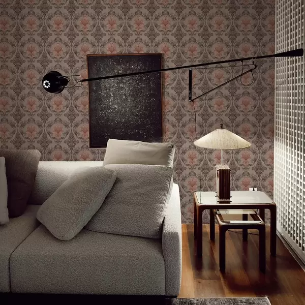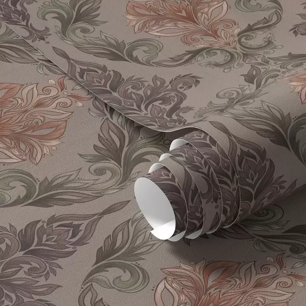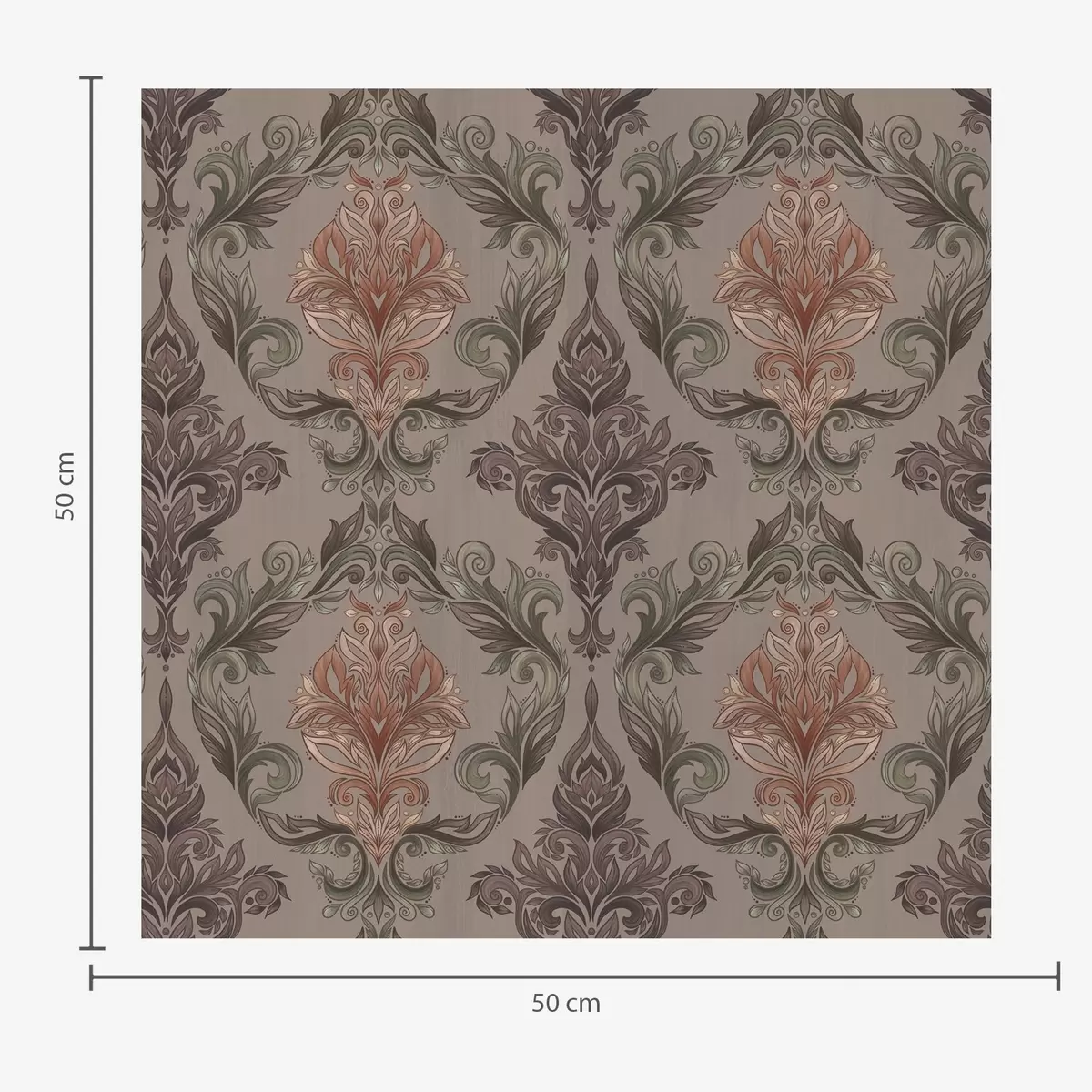 Papel pintado Damasco en tonos marrón-terracota, fondo gris cálido. Nr. a00828v2
