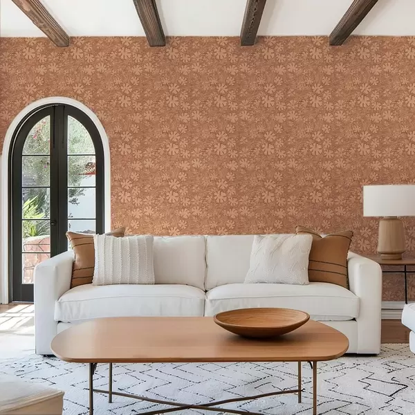 Papel pintado Hojas y hierbas del campo en una paleta de colores terracota y beige. Nr. a00847