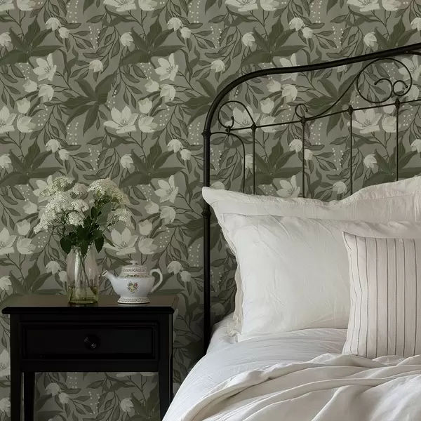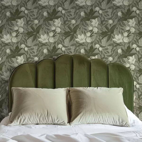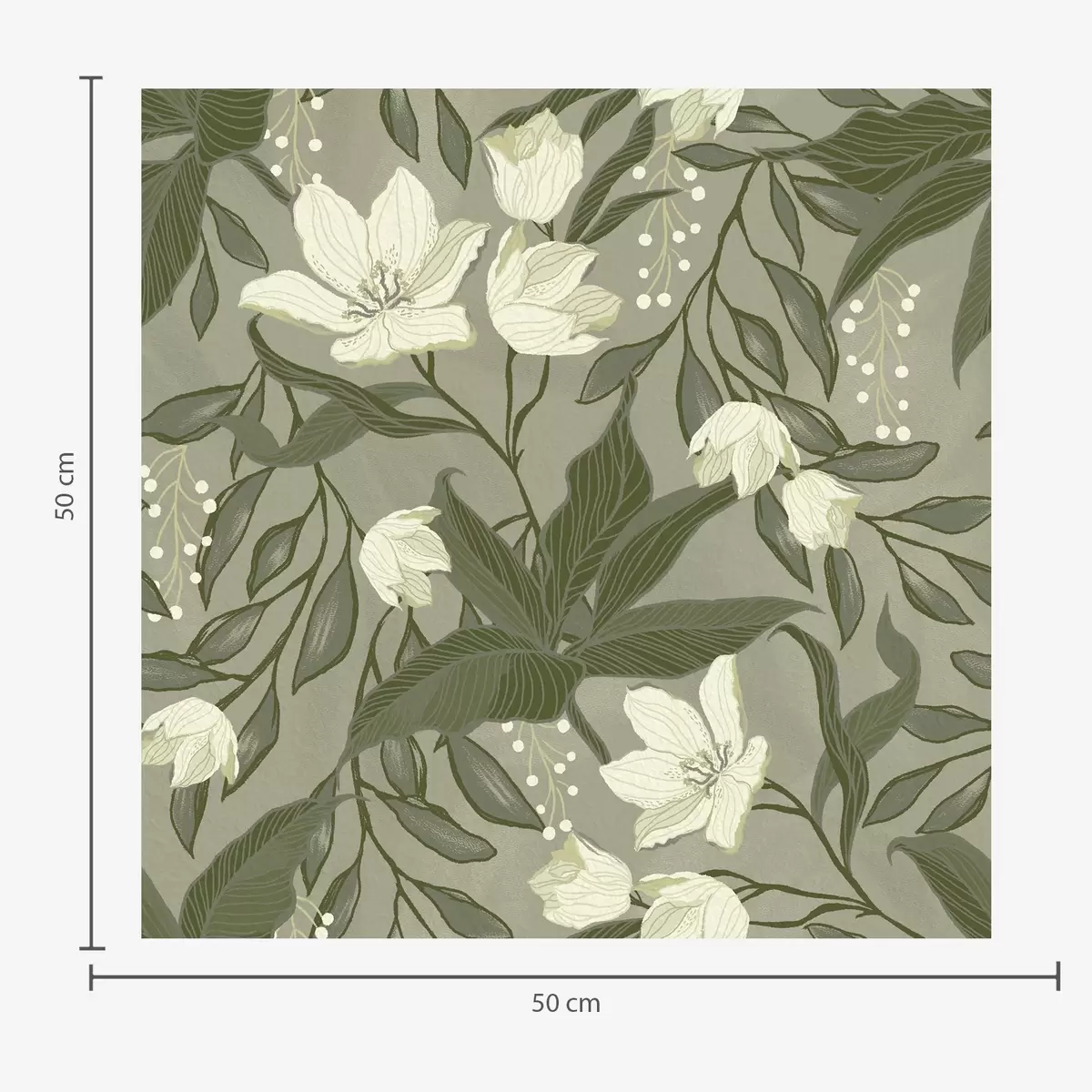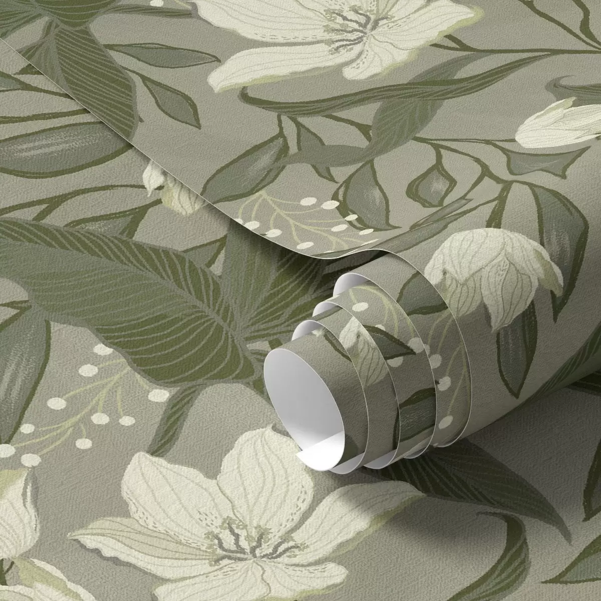 Papel pintado Lirios pálidos y follaje sobre fondo gris oliva. Nr. a00854