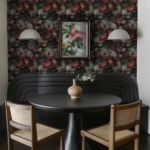 Papel pintado Peonías oscuras y dramáticas, bayas y mariposa sobre fondo negro Nr. a00862