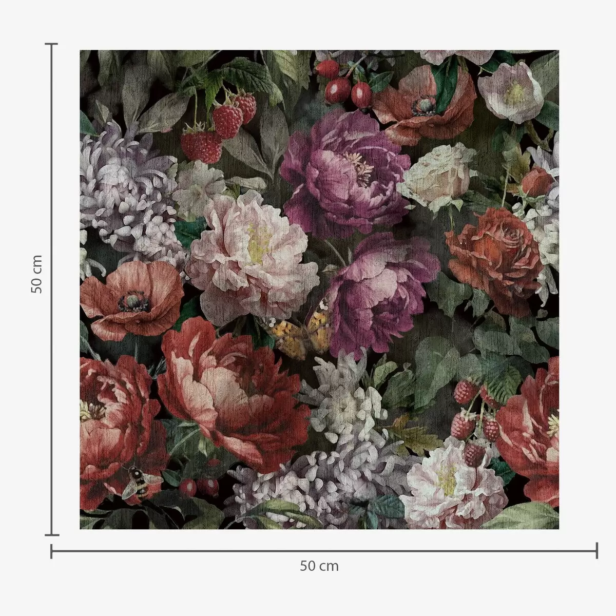 Papel pintado Peonías oscuras y dramáticas, bayas y mariposa sobre fondo negro. Nr. a00862