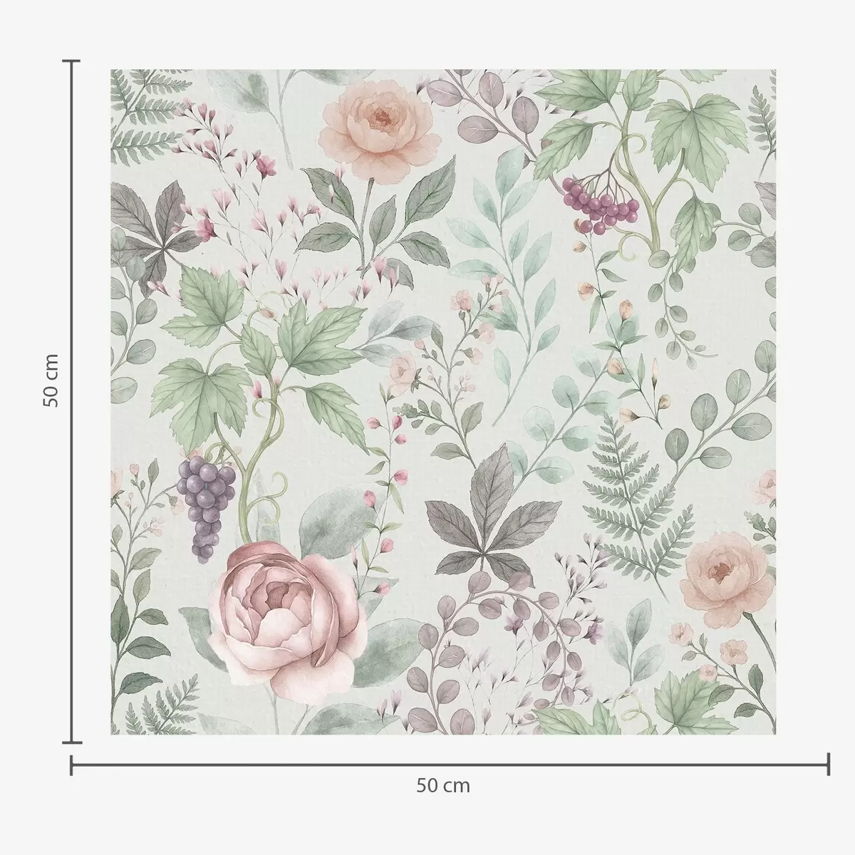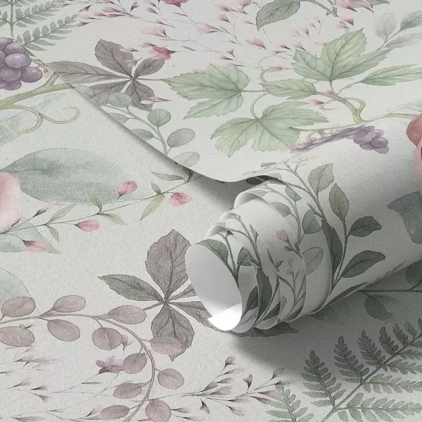 Papel pintado Jardín en tonos pastel con rosas, helechos y uvas. Nr. a00867