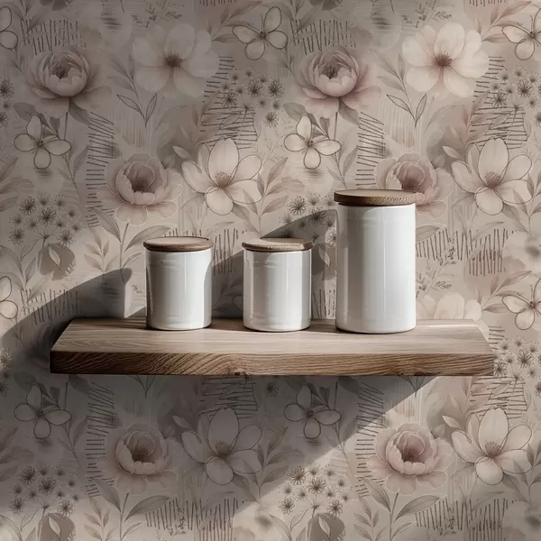 Papel pintado Estampado floral en tonos beige sepia con detalles lineales y mariposas. Nr. a00870