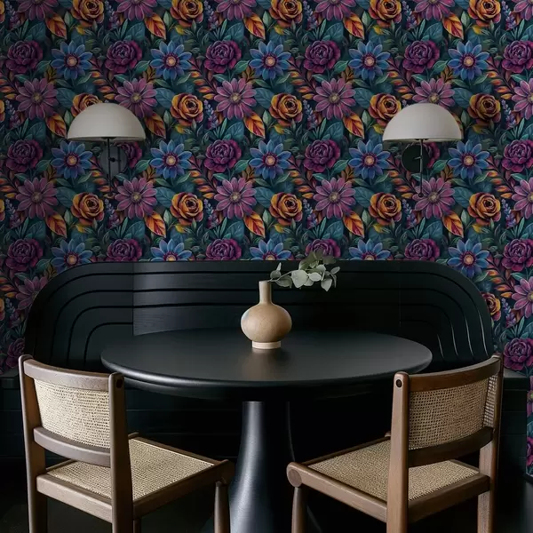 Papel pintado Vibrantes motivos florales en tonos joya sobre fondo azul marino intenso Nr. a00871