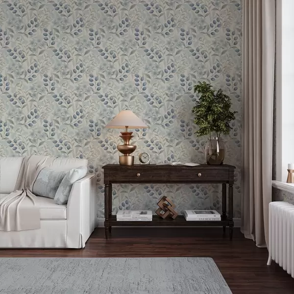 Papel pintado Arándanos azules y flores claras sobre marfil a00872