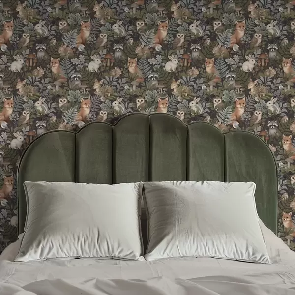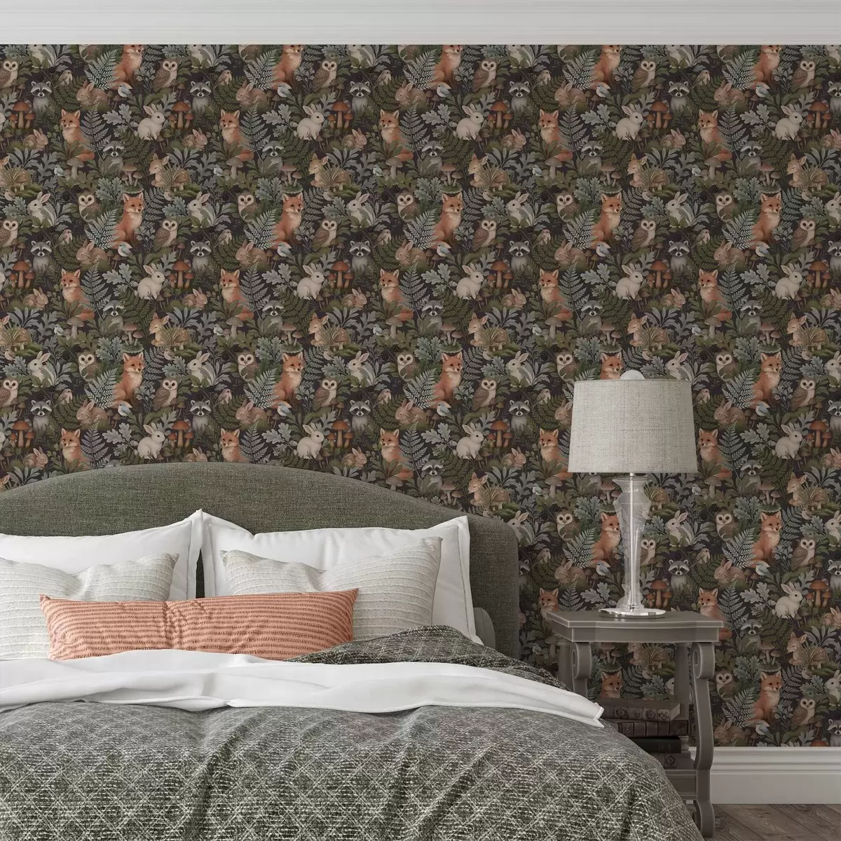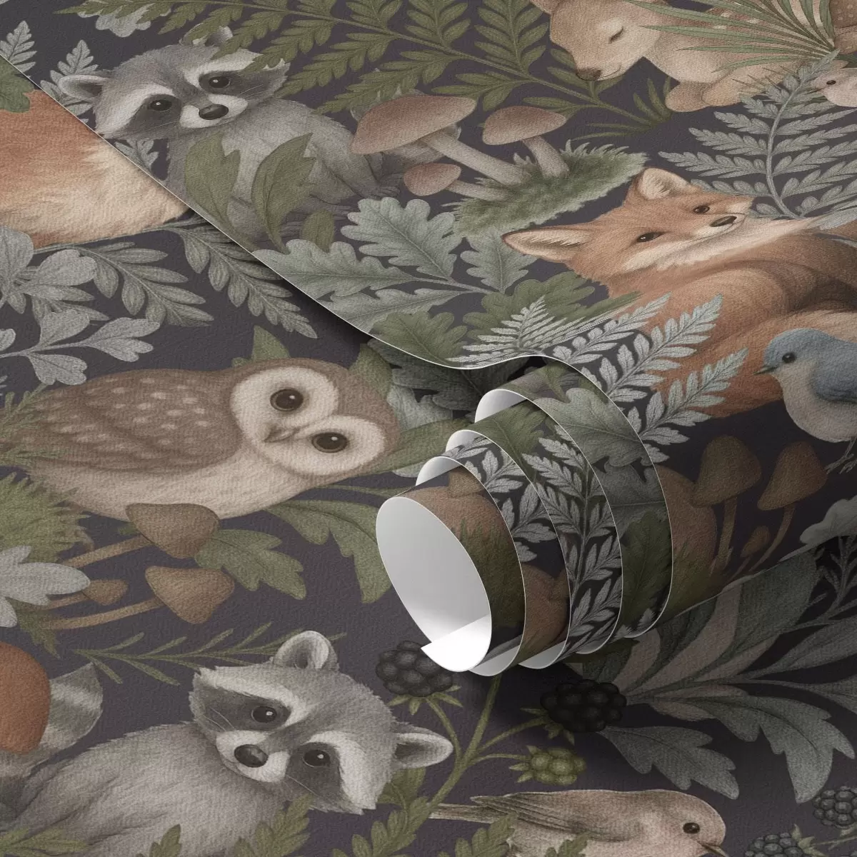 Papel pintado Animales del bosque y helechos sobre carbón oscuro Nr. a00880