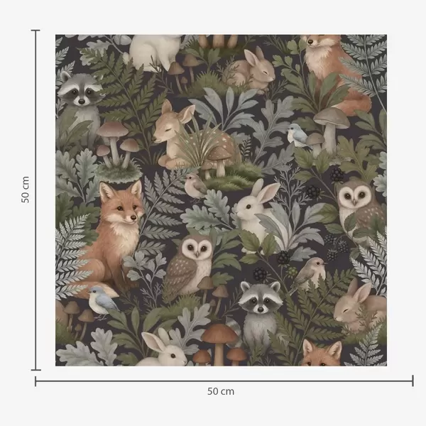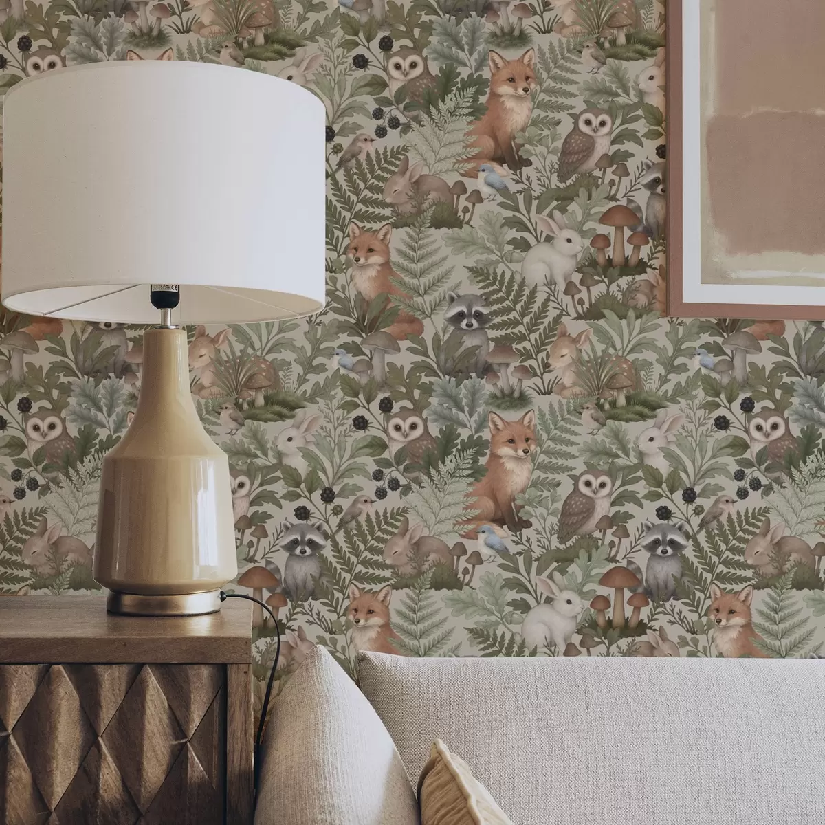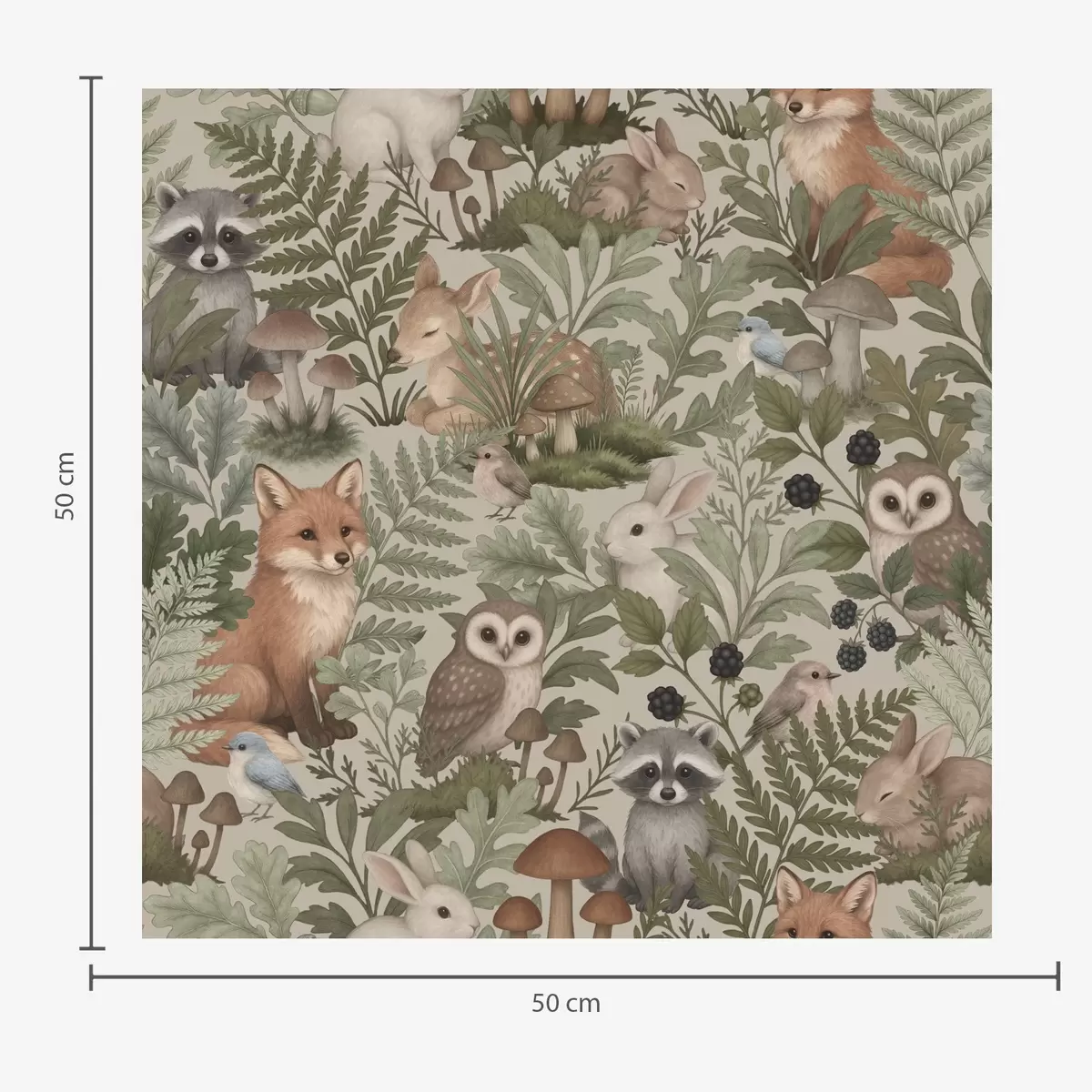 Papel pintado Animales del bosque, helechos y setas sobre fondo beige claro. Nr. a00880v1