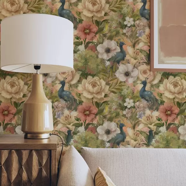 Papel pintado Jardín pintoresco con pavos reales y flores grandes Nr. a00885