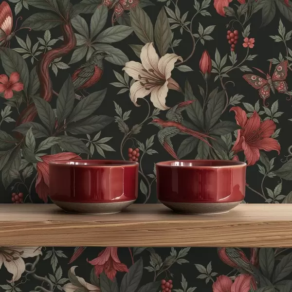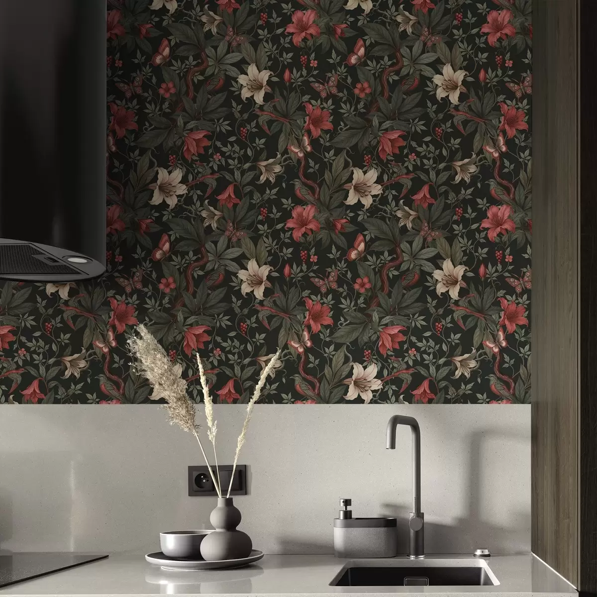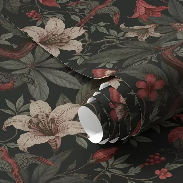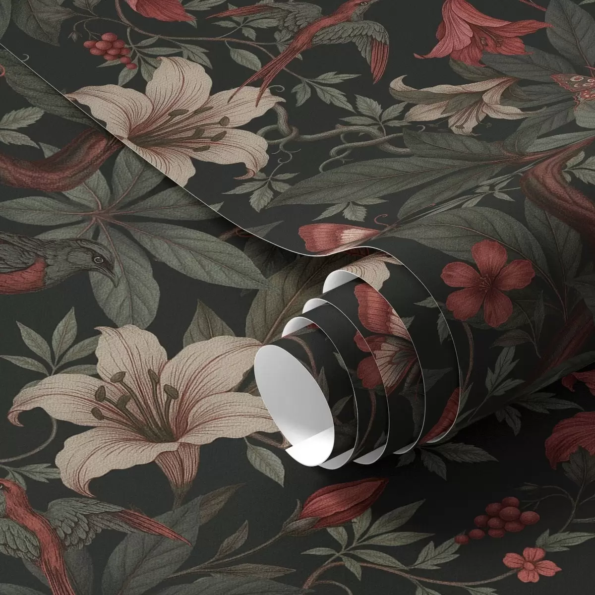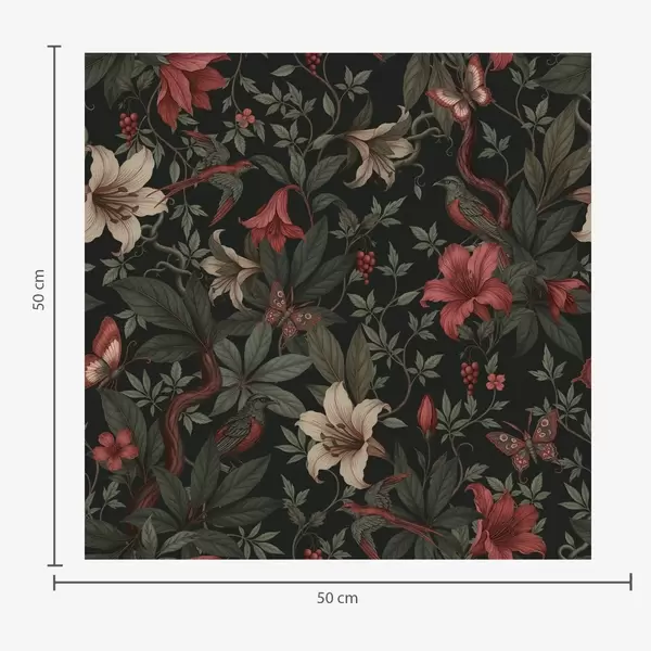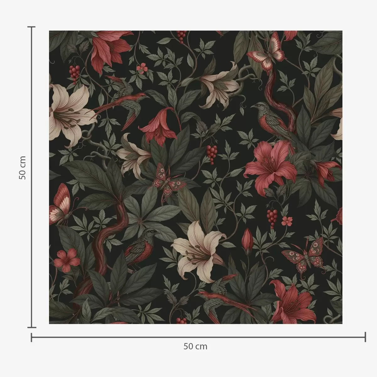 Papel pintado Flores oscuras de la selva con pájaros y mariposas Nr. a00895