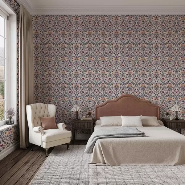 Papel pintado Damasco floral con mariposas sobre fondo melocotón suave. Nr. a00926