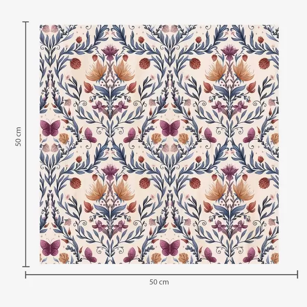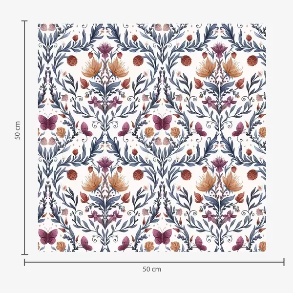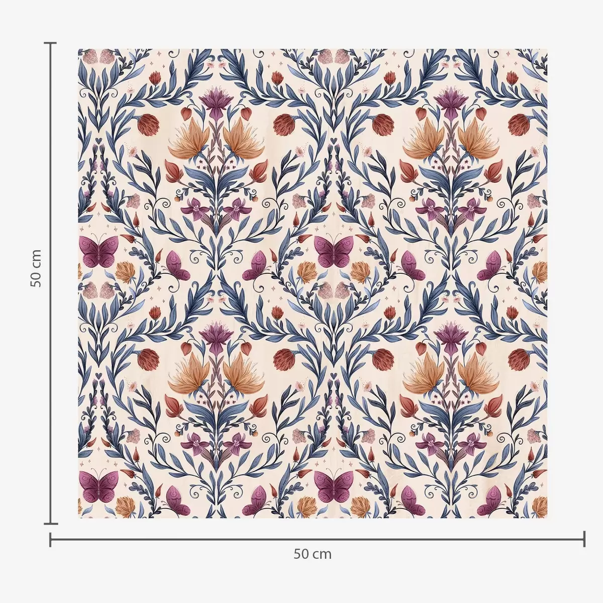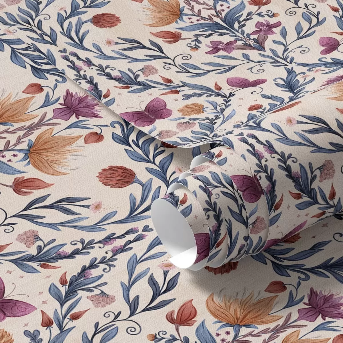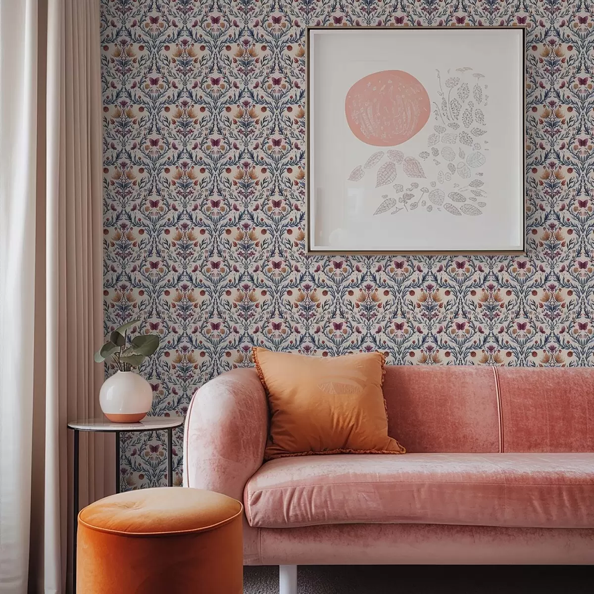 Papel pintado Damasco floral con mariposas sobre fondo melocotón suave. Nr. a00926