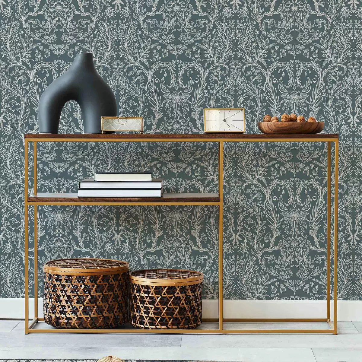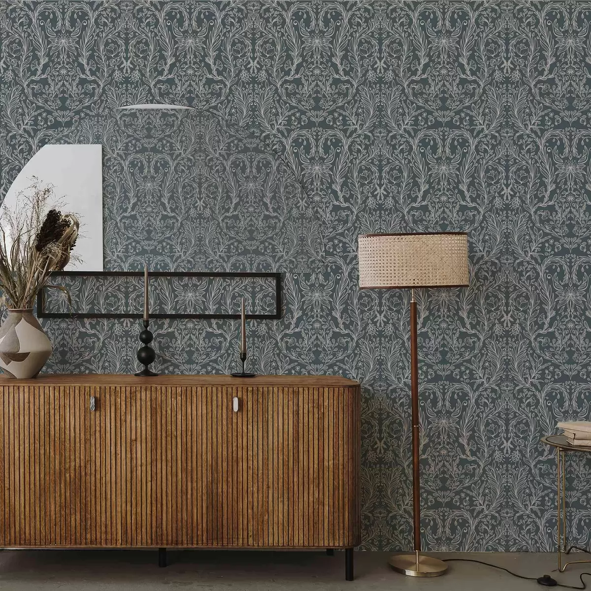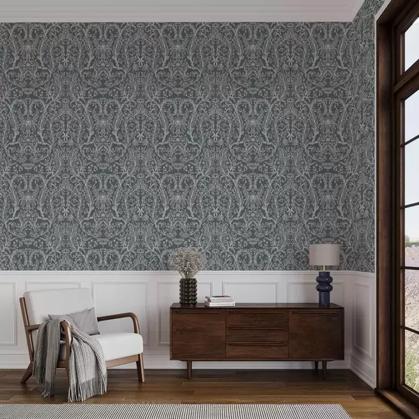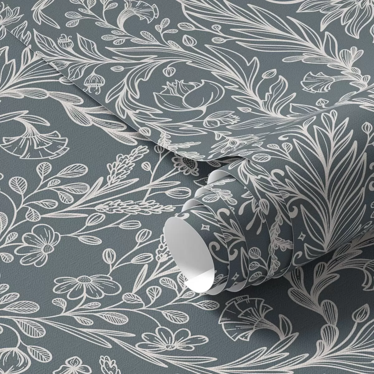 Papel pintado Adorno floral lineal sobre fondo gris azulado. Nr. a00929v1