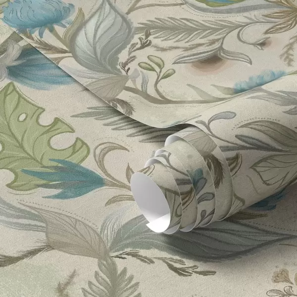 Papel pintado Capullos y hojas azules sobre un fondo beige claro. Nr. a00930