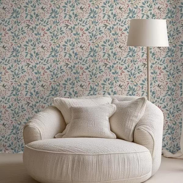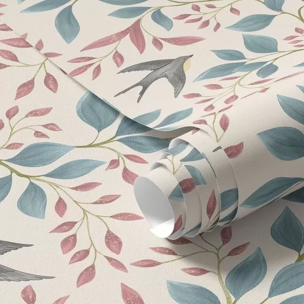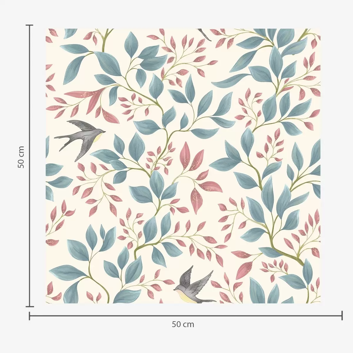 Papel pintado Ramitas azules y rosas con pájaros sobre fondo crema. Nr. a00933