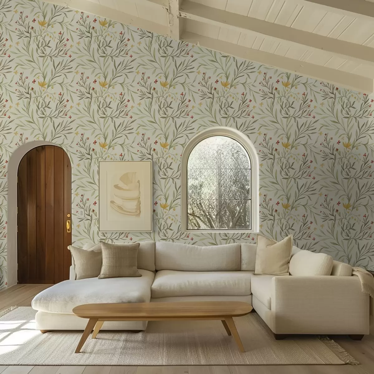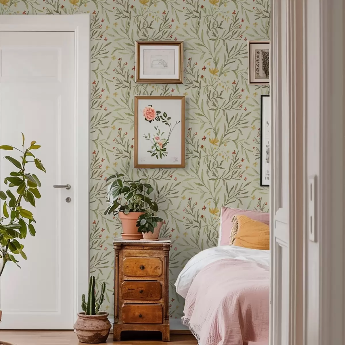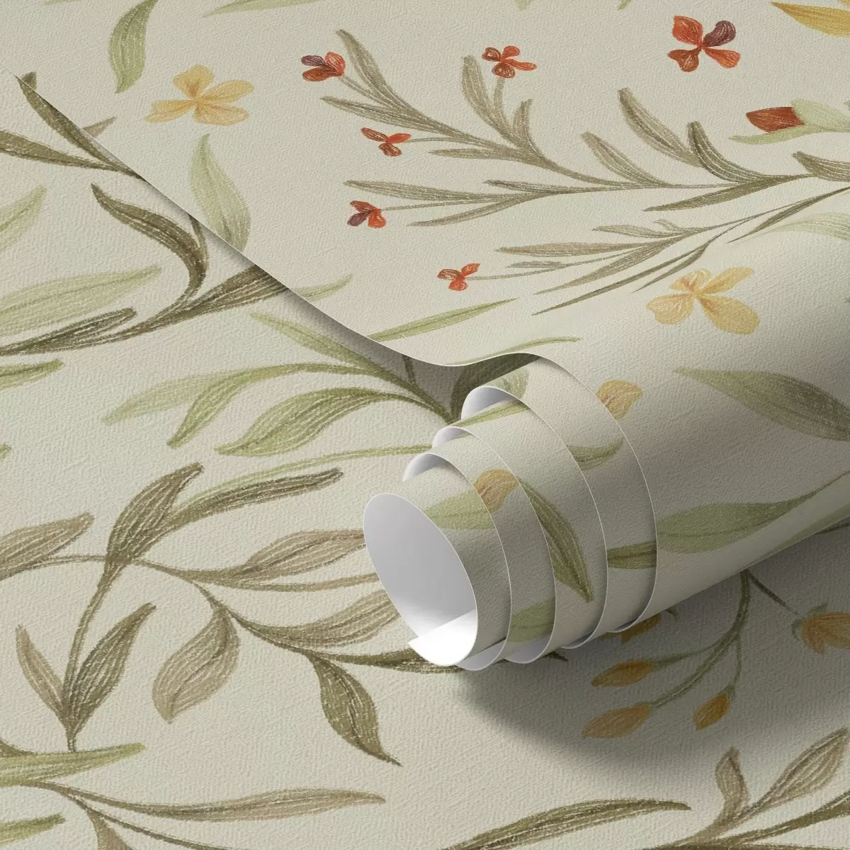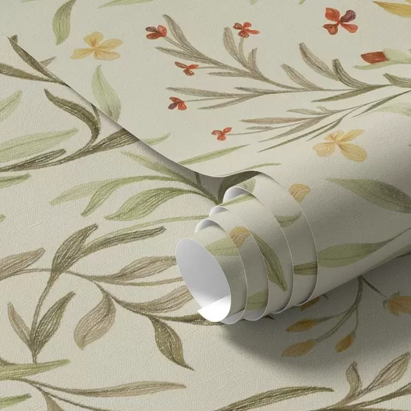 Papel pintado Flores amarillas y rojas sobre un fondo verde claro. Nr. a00937