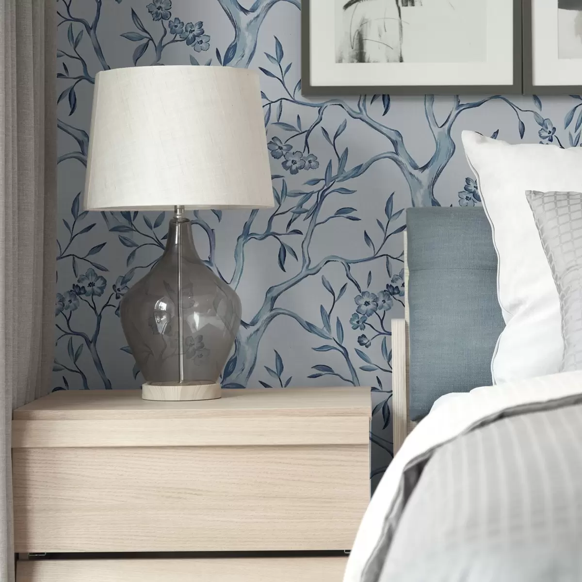Papel pintado Ramas azules acuareladas con flores y mariposas sobre fondo claro. Nr. a00951